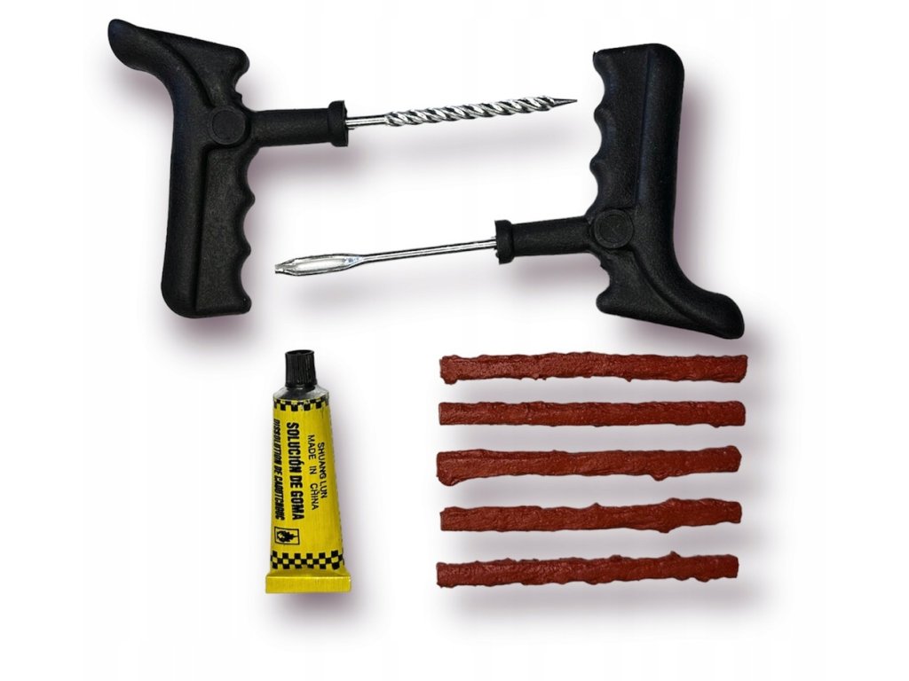 V nabídce si můžete zakoupit sadu 8 prvků pro vlastní opravu poškozených pneumatik. Nezbytnost každého kutila v jeho garáži a v každém profesionálním servisu pneumatik. Oprava pomocí tohoto setu je velmi rychlá, jednoduchá a zároveň trvanlivá.