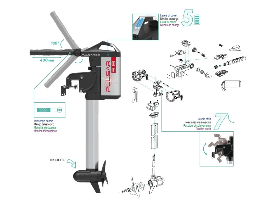 3.0 poskytuje tah 110lbs z 29,6V LIPO (lithium polymer) baterie, která napájí střídavý motor. Vynikající motor pro malá plavidla, jako jsou nafukovací tendry, pevné tendry a v některých případech menší jachty nebo jako záložní pomocný motor. S plynulou regulací rychlosti vpřed nebo vzad a magnetickým bezpečnostním lankem. Motor lze snadno naklonit do vody i z vody, takže můžete motor provozovat téměř v každé hloubce vody. Baterie LIPO je vyjímatelná pro nabíjení a k dispozici je i varianta náhradní baterie. Nabíječka baterií je součástí dodávky. LED indikátor stavu baterie poskytuje přehled o stavu baterie. Vhodné pro použití ve slané i sladké vodě.