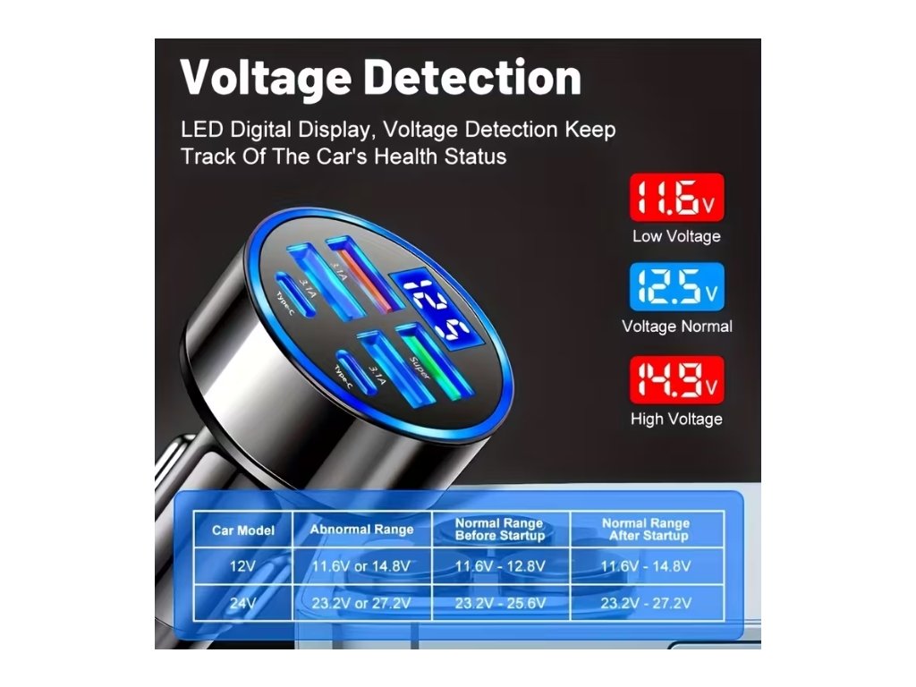 4 USB + 2 PD rychlé nabíjení, USB Type C rychlé nabíjení, QC3.0 Voltmetr - stav napětí