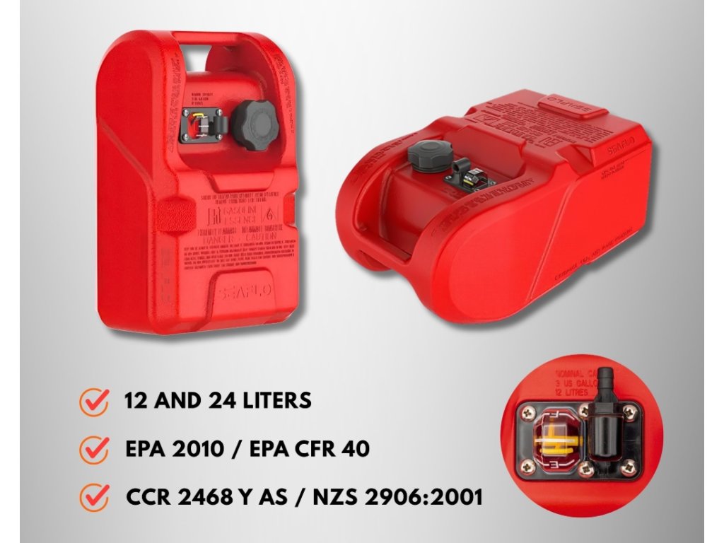 Kvalitní přenosná palivová nádrž pro lodě o objemu 12 litrů, s ukazatelem hladiny paliva. Je vyroben z pevného a odolného dvouvrstvého HDPE materiálu. Automatický vakuový ventil zajišťuje správný průtok paliva a eliminuje potřebu ručního odvzdušnění. Přenosná palivová nádrž byla vytvořena pro použití ve všech námořních aplikacích. Vyhovuje předpisům EPA 2010 a splňuje normy EPA CFR 40, California CCR 2468 a AS/NZS 2906:2001.