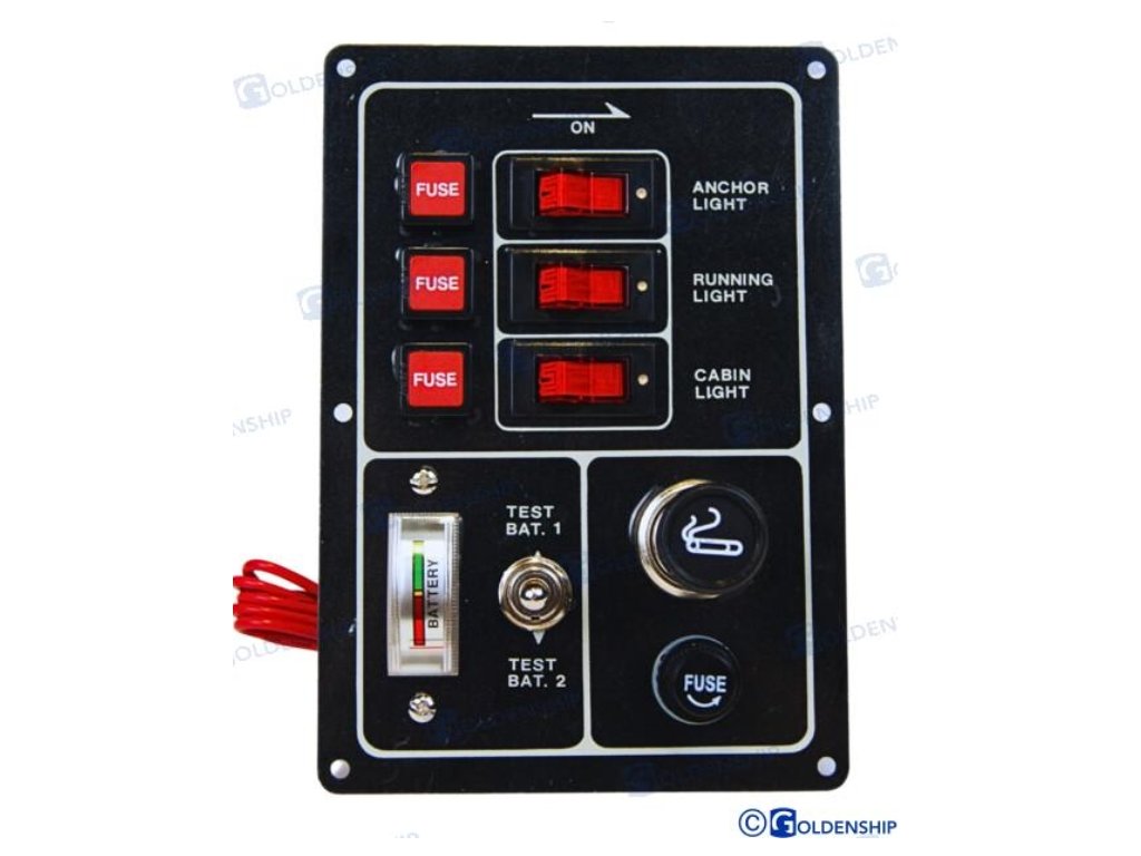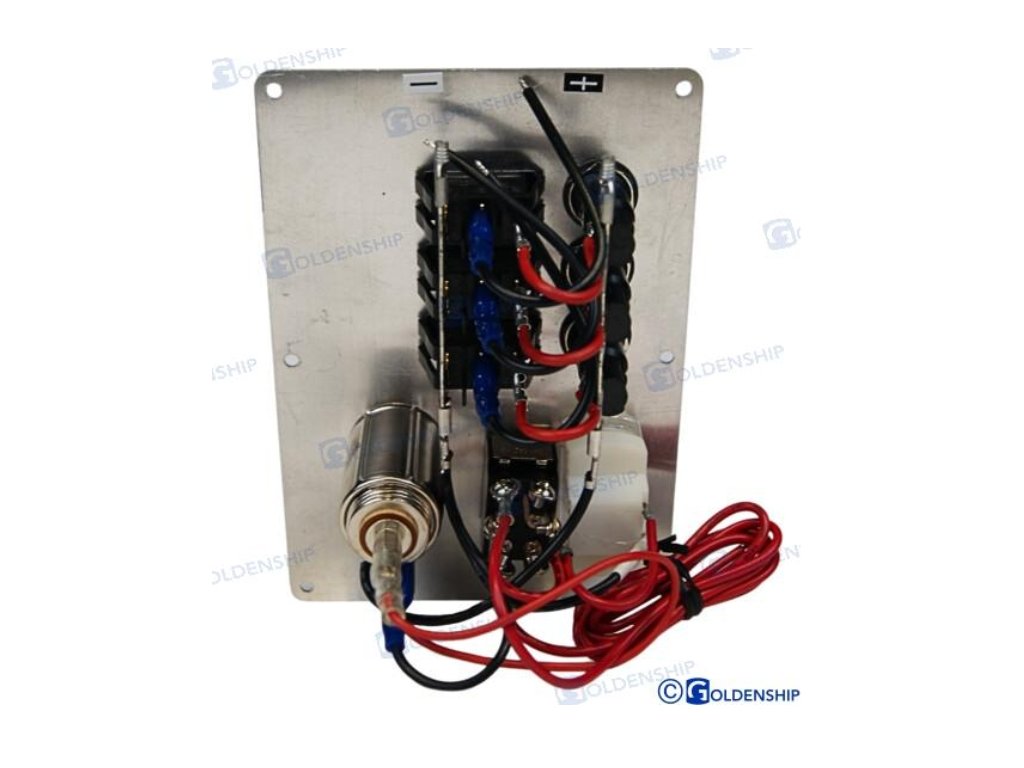 ČERNÝ ELOXOVANÝ HLINÍKOVÝ PANEL SE 3 OSVĚTLENÝMI KOLÉBKOVÝMI SPÍNAČI. OBSAHUJE TESTER BATERIÍ, ZAPALOVAČ CIGARET A DRŽÁK POJISTKY 15A 12V.
