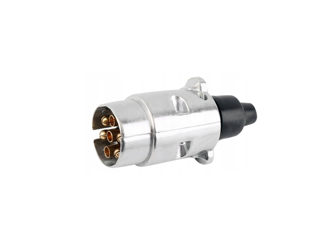Zástrčka přívěsu 7 – pinová, stáčená. Univerzální zástrčka, která se hodí pro jakýkoli typ přívěsu nebo odtahového vozu. Kryt zástrčky je vyroben z kovu. Má zástrčku 12 V a kovové PINy, které jsou chráněny proti korozi. Zástrčka se proto skvěle hodí pro jakýkoli přívěs, který bude často stát například na dvoře před domem. Je velmi snadná na montáž a zajišťuje trvalé spojení elektrické instalace přívěsu s vozem a zaručuje nepřetržitý provoz všech světel během jízdy.